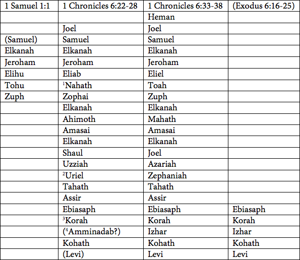 Every genealogy is given for a reason. Each of these genealogies accomplish a different nuance to the purpose of the authors. You may readily notice that some genealogies trace downwards toward a certain son. Other genealogies trace upwards towards a certain ancestor. Most genealogists perceive the downward genealogies as tracing qualities or characteristics. The forefather is passing on something to his children. The upward genealogies are perceived to trace pedigree or authority. The child inherits a title or serves in a role which has authority based on the ancestor. Applying this to our three lists gives one kind of explanation. 1 Chronicles 6:33ff is tracing from Heman upwards. Heman is the patriarch for a very important Levitical family whom God authorizes to prophecy in song and instrumentation at the temple. Heman’s pedigree here affirms his authority as a prominent Levite and Prophet. 1 Chronicles 6:22ff is passing on the leadership baton of Kohath’s family. The sub-tribe of the Kohathites were charged with taking care of the ark, the holy place furniture, the service utensils, and the Holy of Holies veil (Numbers 3:27-32) This gives Samuel direct right to serve in the tabernacle and care for the logistics of service.